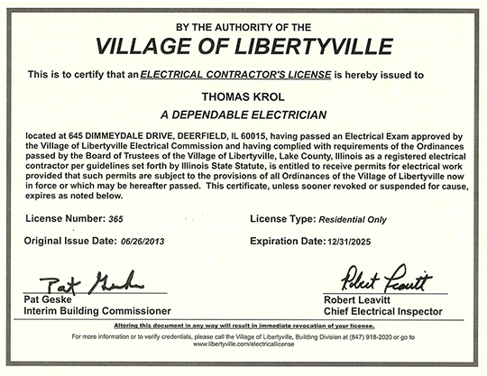 In 2008, he passed the IL state written exam and the physical skills test as well for a residential electrician's license. The test administrator/electrical inspector noted how well Tom performed as a first-time attendee of the test who was also the first to complete the written portion of the exam that day.